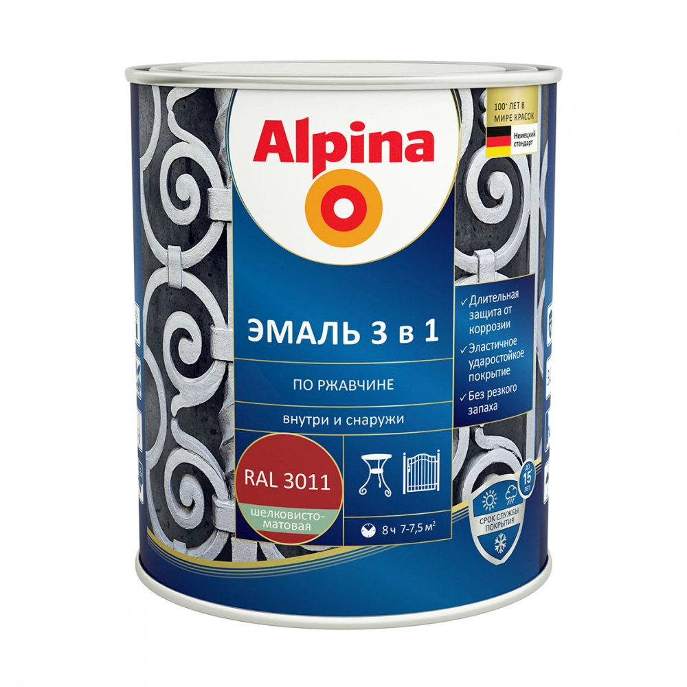 Alpina Эмаль по ржавчине 3 в 1 – это высококачественная алкидно-уретановая эмаль, предназначенная для защиты и декоративной отделки металлических поверхностей, подверженных коррозии. Краска сочетает в себе три функции: преобразователь ржавчины, грунт и финишное покрытие, что значительно упрощает процесс обработки. Обладает отличной адгезией к металлу, включая уже поврежденные участки, и образует прочное, износостойкое покрытие, устойчивое к влаге, перепадам температур и механическим воздействиям. Доступна в насыщенном красно-коричневом оттенке RAL 3011, который сохраняет яркость даже под воздействием ультрафиолета.