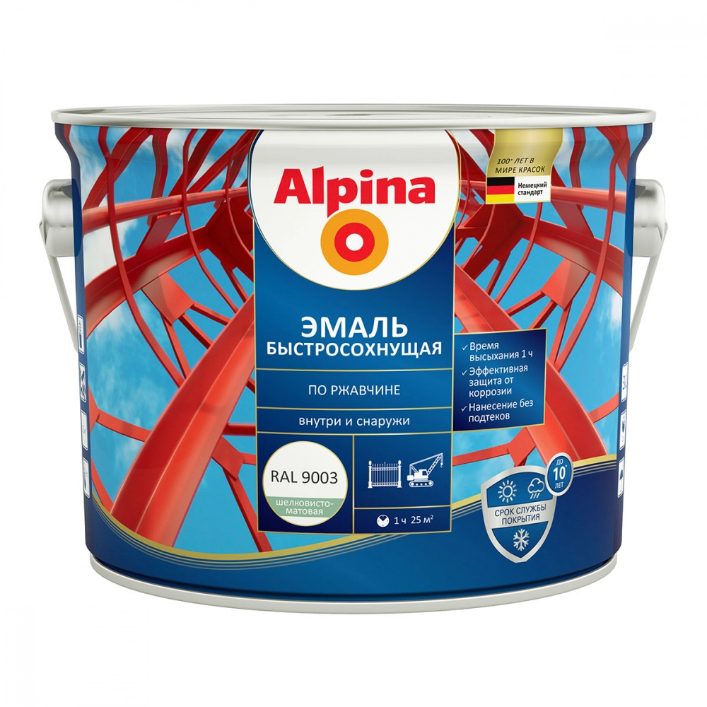 Грунт-эмаль Alpina алкидная быстросохнущая по ржавчине шелковисто-матовая RAL 9003 2,5 л — это универсальное решение для защиты и декоративной отделки металлических поверхностей. Состав предназначен для наружных работ, обеспечивая надежное покрытие, устойчивое к атмосферным воздействиям. Благодаря алкидной эмульсии в основе, грунт-эмаль обладает отличной адгезией к металлу, включая поверхности с остатками ржавчины, что значительно упрощает подготовку перед нанесением. Быстросохнущая формула сокращает время работ, а шелковисто-матовая текстура придает покрытию эстетичный внешний вид.