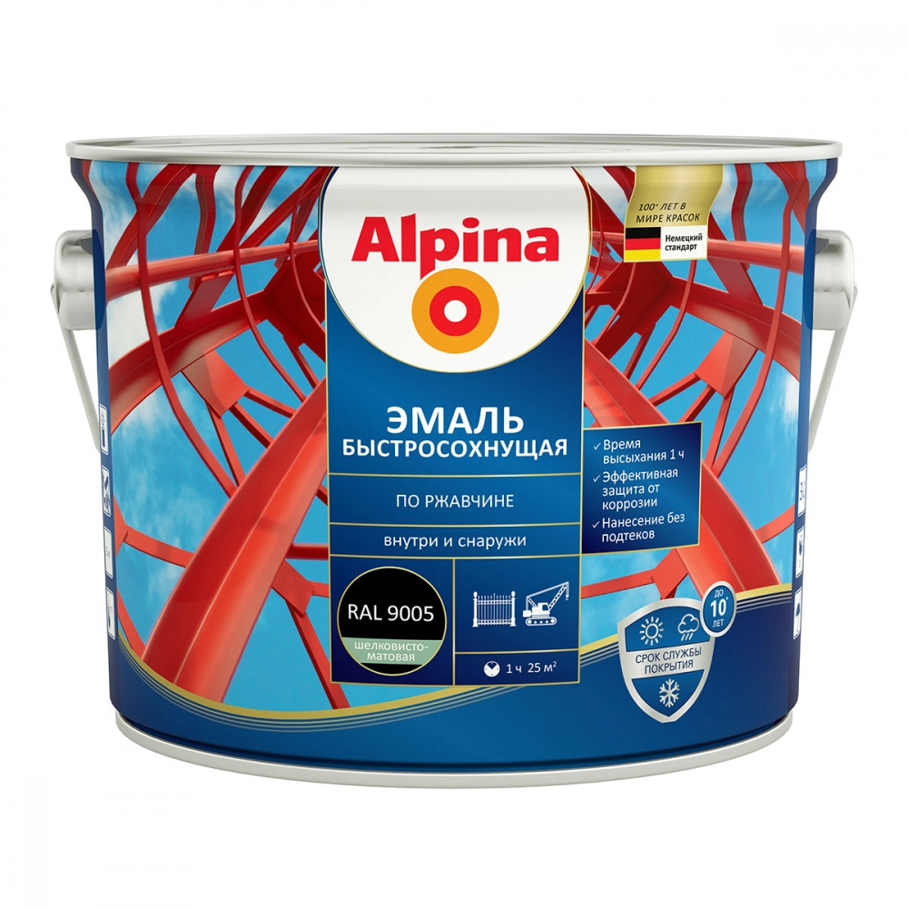 Грунт-эмаль Alpina алкидная быстросохнущая по ржавчине шелковисто-матовая RAL 9005 2,5 л — это универсальное решение для защиты и декоративной отделки металлических поверхностей. Состав на основе алкидной эмульсии обеспечивает высокую адгезию и надежное покрытие, предотвращающее дальнейшее развитие коррозии. Благодаря быстросохнущей формуле продукт значительно сокращает время работ, а шелковисто-матовая текстура придает поверхности эстетичный вид. Грунт-эмаль подходит для наружных работ, устойчива к атмосферным воздействиям, включая влагу и перепады температур, что делает ее идеальным выбором для обработки металлических конструкций, ограждений, труб и других элементов.