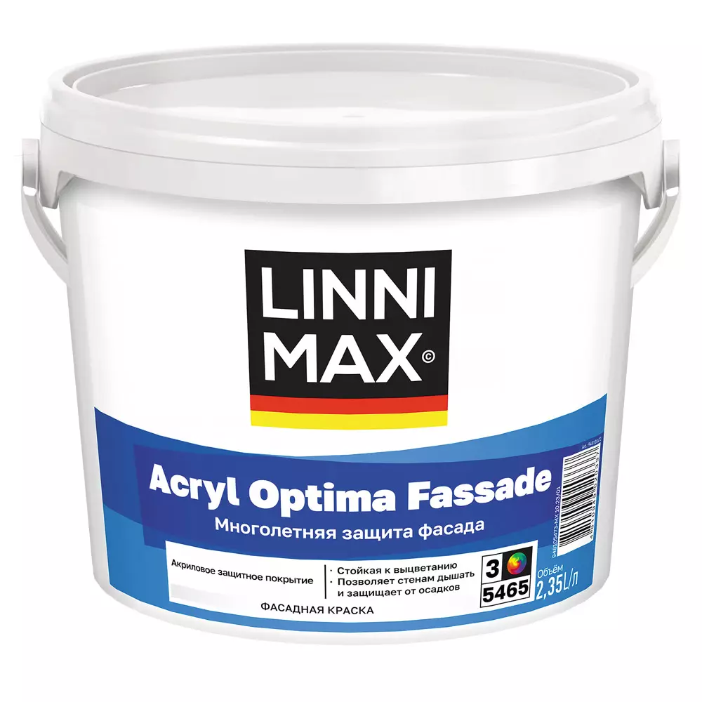 **Преимущества:** состав на водной основе отличается экологичностью, быстрым высыханием и устойчивостью к атмосферным воздействиям, включая дождь, ультрафиолет и перепады температур. Краска образует прочное, паропроницаемое покрытие, предотвращающее появление плесени и грибка. Удобная фасовка 2,35 л подходит для профессионального и бытового применения, а акриловая основа обеспечивает легкое нанесение и экономичный расход. Бренд LINNIMAX гарантирует высокое качество и долгий срок службы покрытия даже в условиях интенсивной эксплуатации.