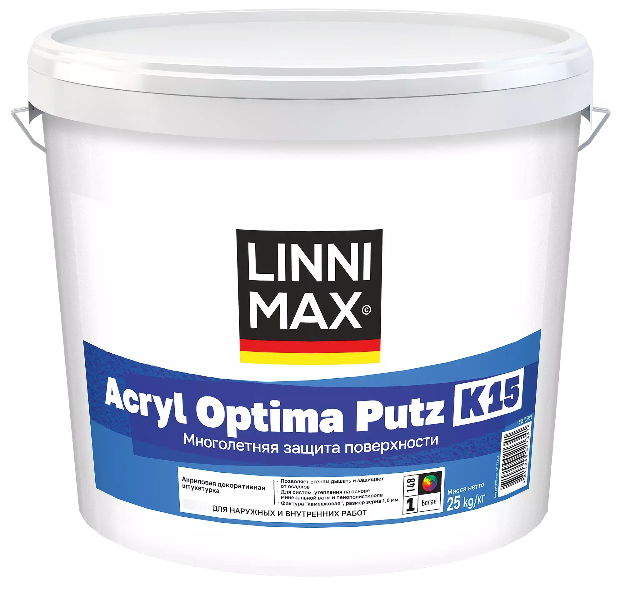 Штукатурка декоративная акриловая LINNIMAX Acryl Optima Putz (Акрил Оптима Путц K15 База 1) – это высококачественный материал для создания декоративно-защитного финишного слоя на различных поверхностях. Основой штукатурки является акрил, что обеспечивает ей отличную адгезию, эластичность и устойчивость к внешним воздействиям. Продукт подходит для внутренних и наружных работ, что делает его универсальным решением для отделки стен, вертикальных и наклонных поверхностей. Штукатурка может наноситься как вручную, так и с помощью машинного оборудования, что значительно упрощает процесс работы и позволяет добиться равномерного покрытия.