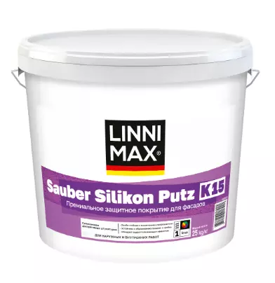 Штукатурка декоративная силиконовая LINNIMAX Sauber Silikon Putz / Заубер Силикон Путц K15 База 1 25 кг – это высококачественный материал для наружных работ, предназначенный для создания долговечного и эстетичного финишного покрытия. Основой штукатурки является силикон, что обеспечивает ей отличные эксплуатационные характеристики: устойчивость к влаге, перепадам температур и ультрафиолетовому излучению. Благодаря этому покрытие сохраняет свои свойства и внешний вид на протяжении многих лет. Штукатурка подходит для нанесения на различные поверхности, включая бетон, кирпич и цемент, что делает её универсальным решением для фасадных работ.