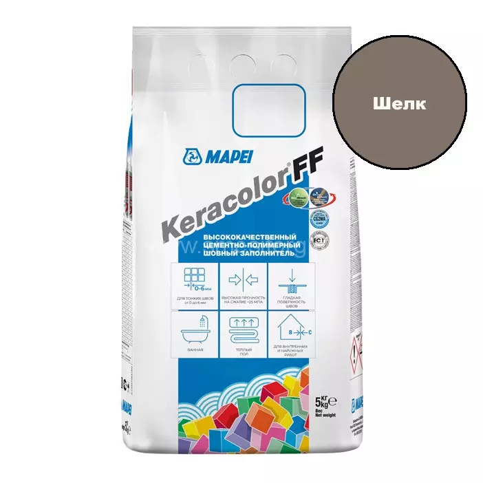Mapei Keracolor FF выпускается в удобной фасовке 5 кг и представлена в широкой цветовой гамме, включая оттенок №134 Шёлк, который придаёт швам благородный матовый эффект. Затирка легко замешивается, обладает хорошей адгезией и пластичностью, что упрощает процесс нанесения. После затвердевания состав сохраняет цвет и не растрескивается, обеспечивая долговечность покрытия. Подходит для внутренних и наружных работ, а также совместим с системами тёплого пола. Для усиления защиты от влаги и грибка рекомендуется использовать совместно с гидрофобизаторами MAPEI.